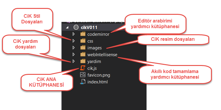 CiK Ana kütüphanesi ve yardımcı kütüphaneleriyle pek çok kod dosyasından oluşur. Ana kütüphane ismi cik.js dir. CiK dosya ve klasör yapısı şöyledir: