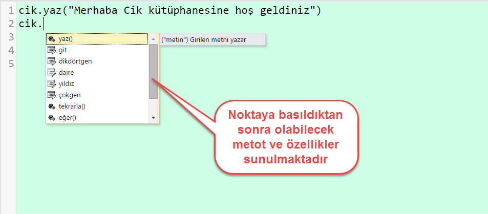 Sayfaya yazı yazdırmak, resim eklemek vs... Birer metottur çünkü bir eylemi gerçekleştirmektedirler. CiK de metotlar akıllı kod tamamlamada