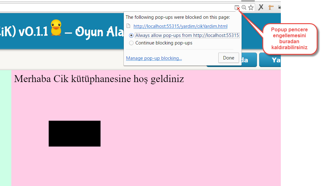 Şu an okuduğunuz yardım sayfasını açar. Bir popup pencere olduğu için browser'ınızdan popup pencere açılması iznini vermeniz gerekir. Adres çubuğunun üzerinde popup olduğunu belirten bir ifade göreceksiniz buraya tıklayarak izin verebilirsiniz.