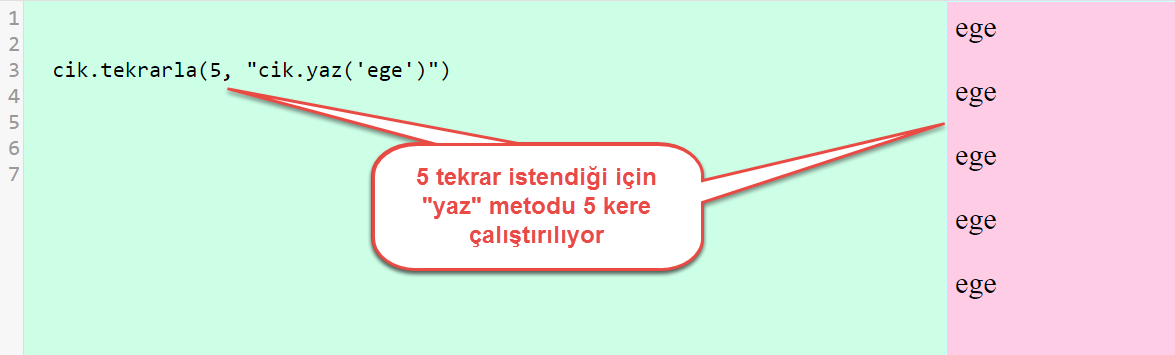 cik.yaz("yazdırmak istediğiniz metin") cik.tekrarla(tekrarSayısı, Metot)