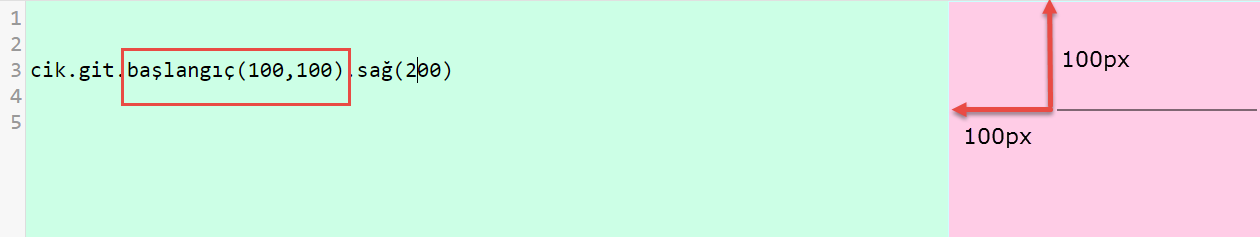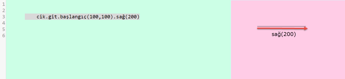 "sağ" metodu çizim yönünü belirtir ve "git.başlangıç(yatayUzaklık,dikeyUzaklık)" metodunun devamında zincirleme olarak kullanılır. Bakış açımıza göre sağ tarafa parametrede belirtilen uzunluk kadar bir çizgi çizer.