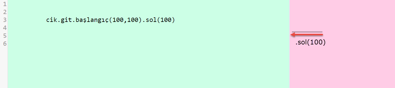 "sol" metodu çizim yönünü belirtir ve "git.başlangıç(yatayUzaklık,dikeyUzaklık)" metodunun devamında zincirleme olarak kullanılır. Bakış açımıza göre sol tarafa parametrede belirtilen uzunluk kadar bir çizgi çizer.