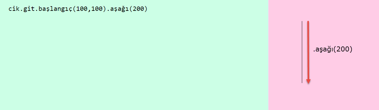 "aşağı" metodu çizim yönünü belirtir ve "git.başlangıç(yatayUzaklık,dikeyUzaklık)" metodunun devamında zincirleme olarak kullanılır. Bakış açımıza göre aşağı tarafa parametrede belirtilen uzunluk kadar bir çizgi çizer.