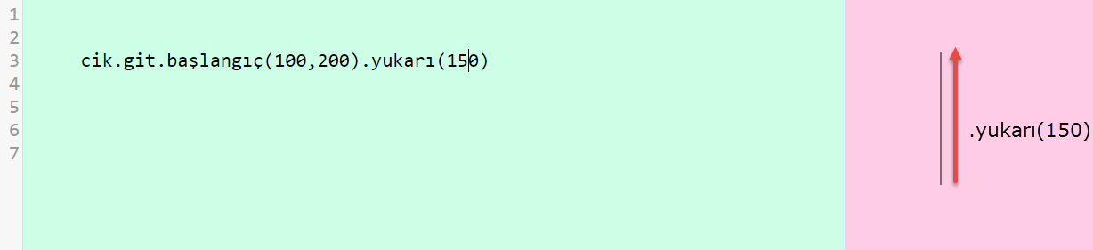 "yukarı" metodu çizim yönünü belirtir ve "git.başlangıç(yatayUzaklık,dikeyUzaklık)" metodunun devamında zincirleme olarak kullanılır. Bakış açımıza göre yukarı tarafa parametrede belirtilen uzunluk kadar bir çizgi çizer.