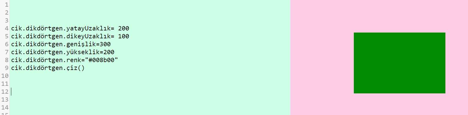 Bu nesneler kütüphane geliştikçe daha da artacaktır. Nesneler "kenar uzunluğu", "renk" vb. gibi "özelliklere" sahiptir. Özelliklere Değer atayarak nesnelerimizin yapılarını değiştirebiliriz. Herhangi bir değer atanmadığı durumlarda "tanımlı" değerleri ile gösterilirler. Nesnelerimiz ayrıc "çiz" isminde metoda da sahiptir. Bu metot nesnelerimizin çizilmesi komutunu verir.